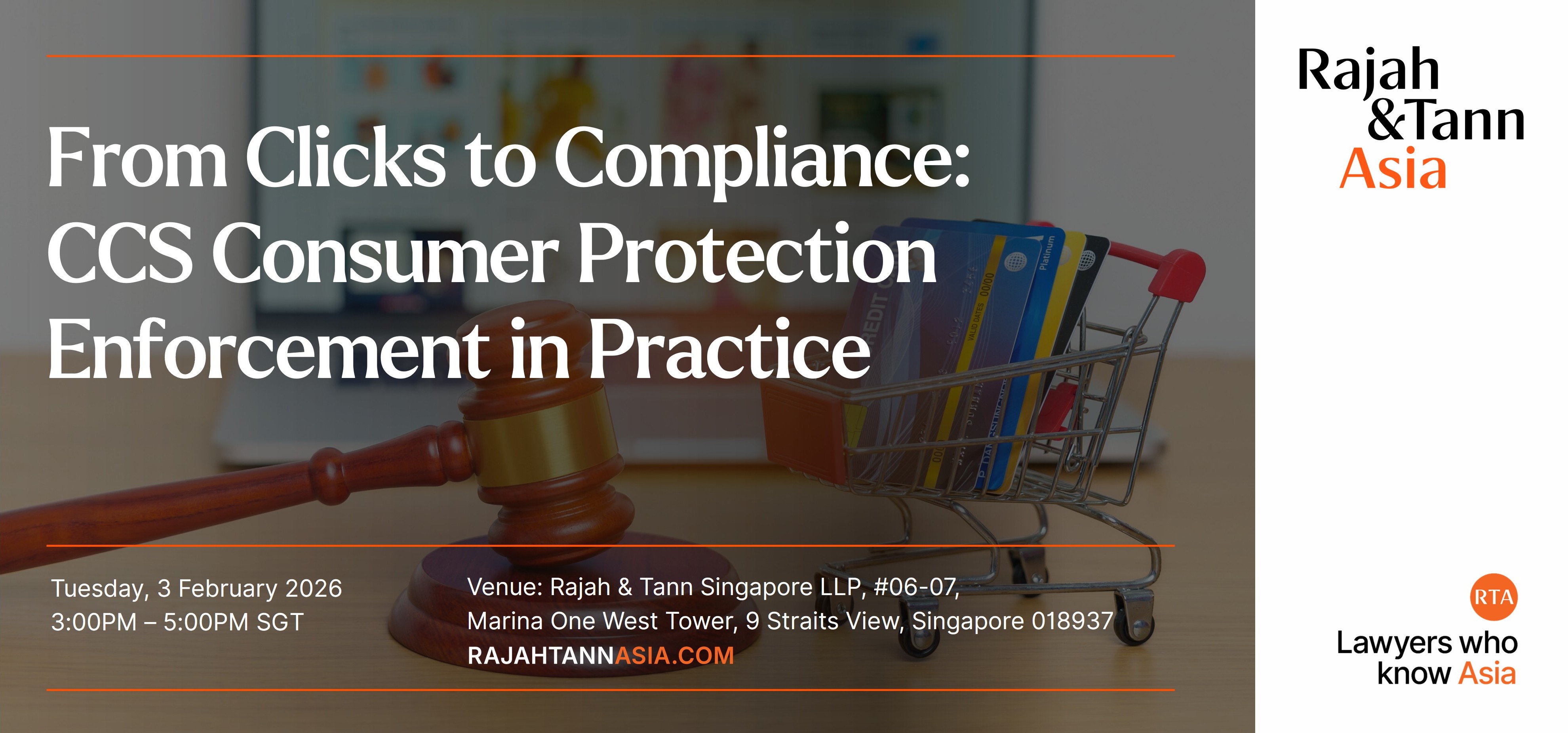 Tuesday, 3 February 2026 | 3.00 pm – 5.00 pm (Singapore Time) Venue: Rajah & Tann Singapore LLP, 9 Straits View,#06-07, Marina One West Tower, Singapore 018937 The Competition and Consumer Commission of Singapore (“CCS”) closed out 2025 with a series of consumer protection interventions - culminating in action against misleading “dark patterns” on major retail websites, new cross‑government standards for e‑commerce conduct, fresh guidance on substantiating product claims, and an expansion of product safety oversight that materially heightens compliance risk for consumer‑facing businesses. These included CCS action against online “dark patterns” and misleading promotions; the refresh of TR 76 on e‑commerce governance; a practical guide on substantiating quality‑related product claims; a market study urging clearer repair, warranty and durability information; heightened Consumer Product Safety Office (“CPSO”) product‑safety surveillance and takedown powers; and renewed focus on endorsements, ratings and “trust” badges. Seeing the rise in enforcement and the importance of consumer protection now, we are doing this session to distil the practical implications of these Q4 2025 moves, examine likely enforcement trajectories for 2026, and translate them into concrete programme updates across product, marketing, e‑commerce and governance functions. We will consider common market practices and whether these could raise concerns under the sharpened enforcement environment. We will discuss: - Dark patterns and online sales pressure: cart add‑ons, countdowns, scarcity claims, and “up to” discounts.